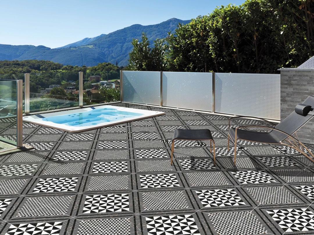 A decorative tile, specifically a ceramic mosaic tile, featuring a striking black and white geometric pattern. The tile incorporates a mix of patterns, including diagonal stripes and triangular formations, creating a dynamic and visually engaging design. It primarily utilises  a high- contrast black and white colour palette, with subtle marble-like veining visible in some of the black sections, adding texture and depth. It's designed for durability and aesthetic in various settings like floors or walls.