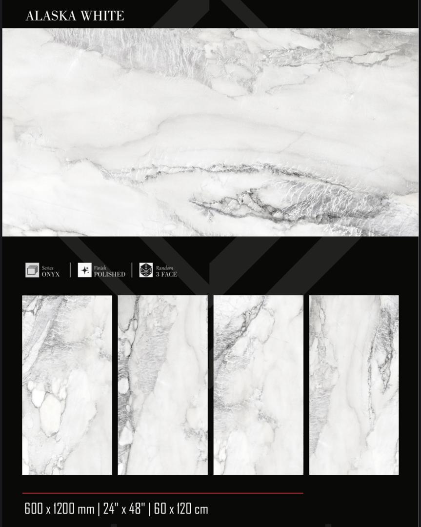 Glossy tiles featuring a white base with prominent grey veining, mimicking the natural patterns found in marble. The veining exhibits varying shades of grey, from lighter, subtle lines to darker, more pronounced streaks, creating a dynamic and sophisticated aesthetic.Its made from porcelain designed to replicate the appearance of natural stone.