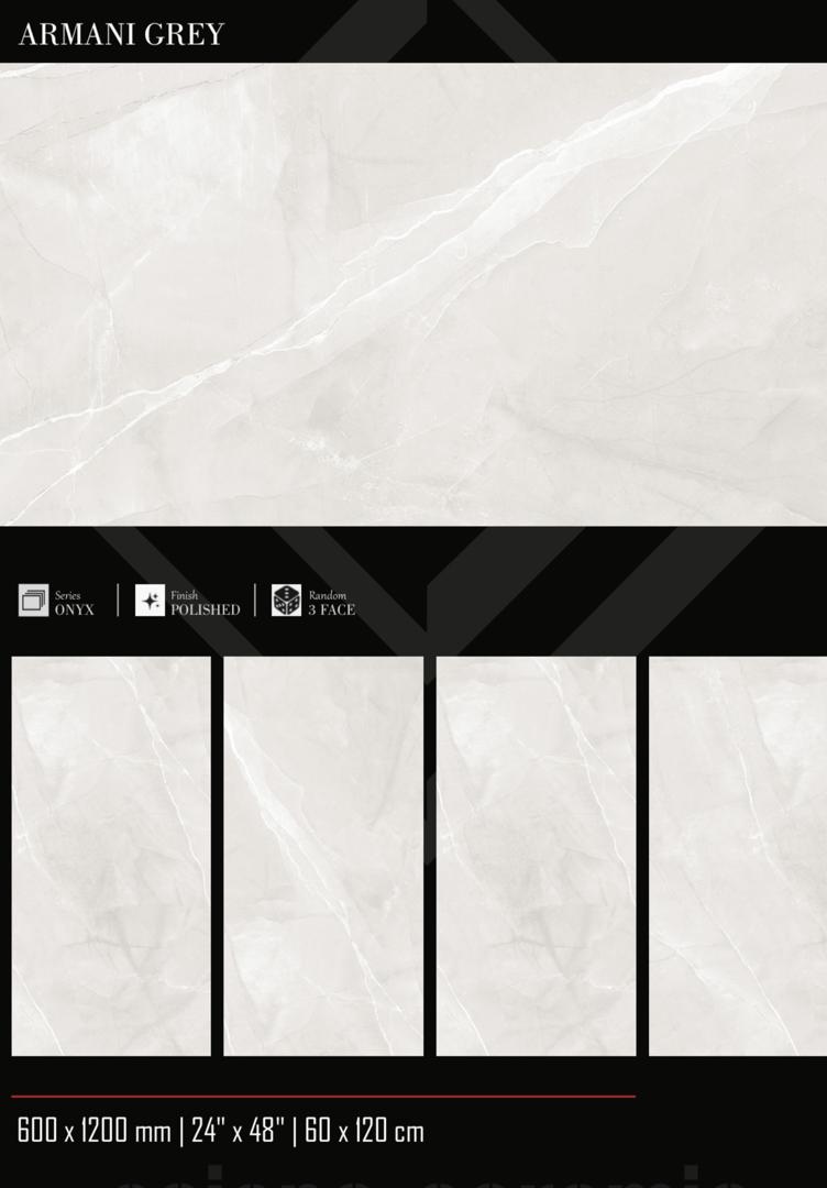 This tile features a polished surface with a marble-effect design, often in gris(grey) colour, but available in other refined colors as well. It portrays light veins on a lighter background, typical of a marble look. Its marble-effect offers durability and resistance.Provides a luxurious and sophisticated look, allows for a smaller minimum joint width for a seamless appearance. It offers resistance and longevity, maintaining its aesthetic over time. Its suitable for various design signs.