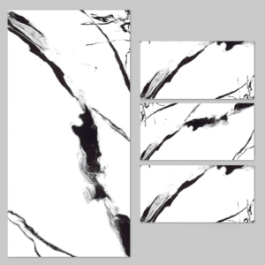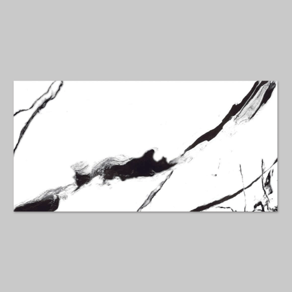 High glossy tile with its material engineered to replicate the appearance of natural marble, which is achieved by a durable glaze layer of liquid glass, giving it a shiny, mirror-like sheen and enhancing  the stark white background with prominent, bold blood veins, creating a modern and beautiful aesthetic reminiscent of classic marble. Its crafted from pure quartz, pigments , and binders, it is designed  for durability and resilience. it is resistant to scratches, stains, and heat , making it suitable for high- traffic areas like kitchen.