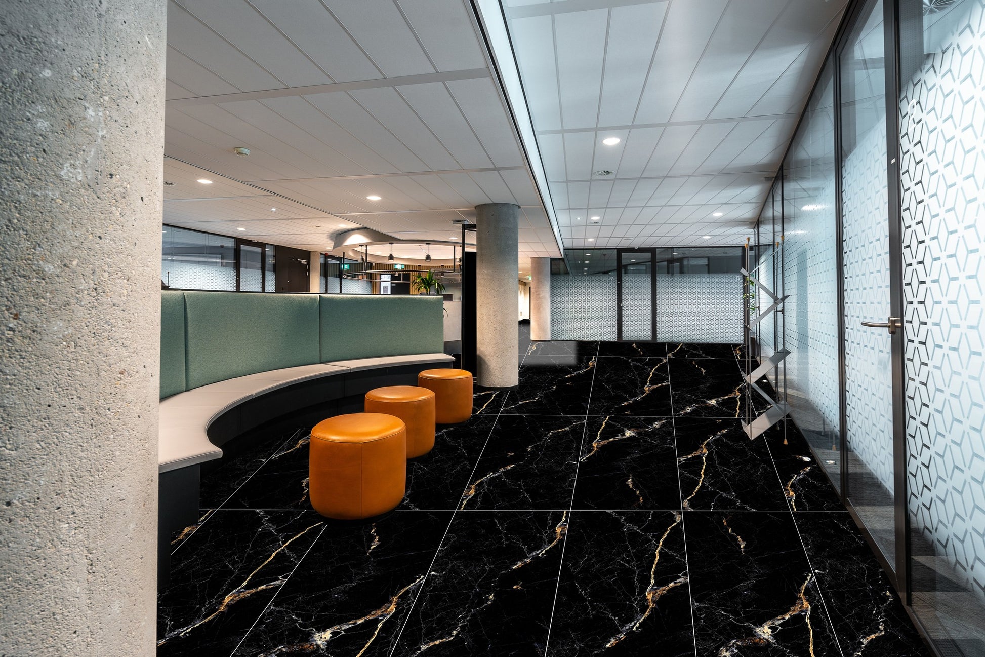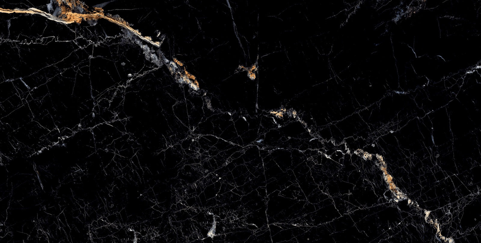 Super high glossy, black marble-look surface tile with a deep black background with prominent, flowing veins in shades of gold and white, mimicking natural black marble with golden inclusions. It is designed to reflect light and enhance the visual depth of the stone effect.Suitable for various interior and exterior decorations, including flooring, walls and other surfaces due to its durability and aesthetic appeal.