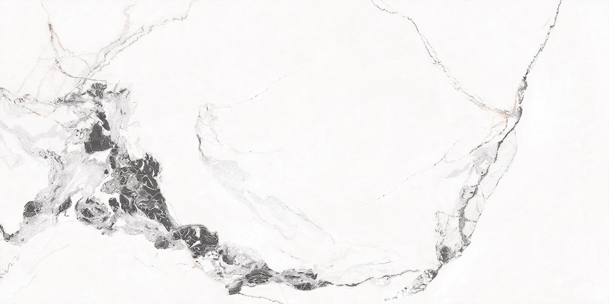 Glossy tile featuring a classic Carrara marble pattern, characterised by black and grey patterns on a pristine white background. It has a very glossy surface that reflects light, enhancing the visual  depth of the design. it is a rectified porcelain  indicating a precise , machine -cut edge for minimal grout lines and a polished finish for a reflective surface.