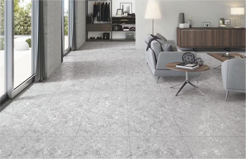 ITs a glossy surface with a marble effect. It draws inspiration from the veined structure of marble, combined with a natural stone texture to create a hybrid surface effect. It's a matte finish emphasizing the natural stone character and a glossy finish. This tile displays a light grey base with intricate, darker veining, mimicking the appearance of natural marble.
