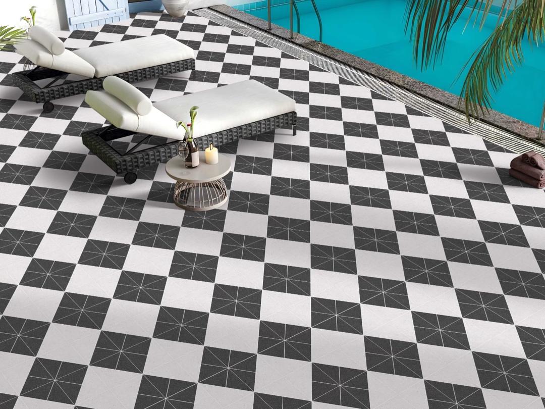 This is a ceramic tile, often replicating the look of aged stone. It features a speckled pattern with variations in neutral tones, set on alternating graphite grey and antique white base glazes. This creates a subtle contrast and adds dimension to the design. The surface typically has a mixed finish, giving it a weathered, mottled appearance that mimics aged stone-look tile. Such tiles are commonly found as ceramic or porcelain, suitable for both floor and wall applications.