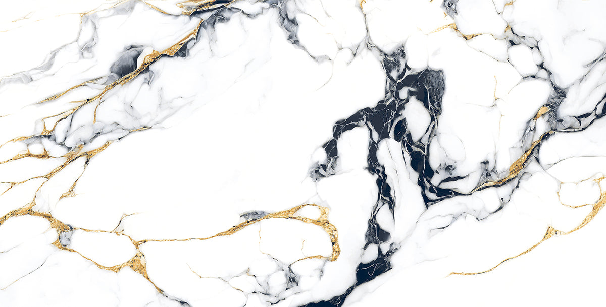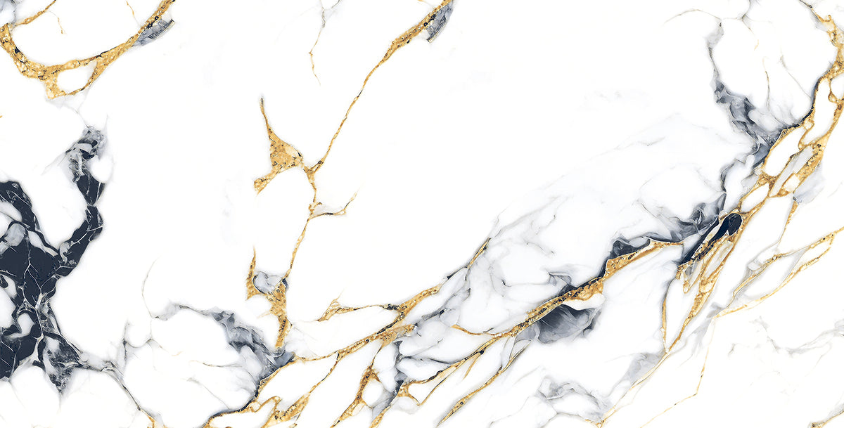 It's a luxurious white marble texture featuring distinguished black , gold and blue striations. The combination of white, black and gold creates an enlightened and elegant look, commonly used for countertops, flooring and wall cladding in hing-end interiors. It is also a form of a polished glazed vitrified tile with an ultra-high glossy finish, offering longevity and a reflective surface that can visually expand a space. It's idle for less trafficked indoor areas or as a decorative wall covering, due to its PEI 2 abrasion resistance rating.