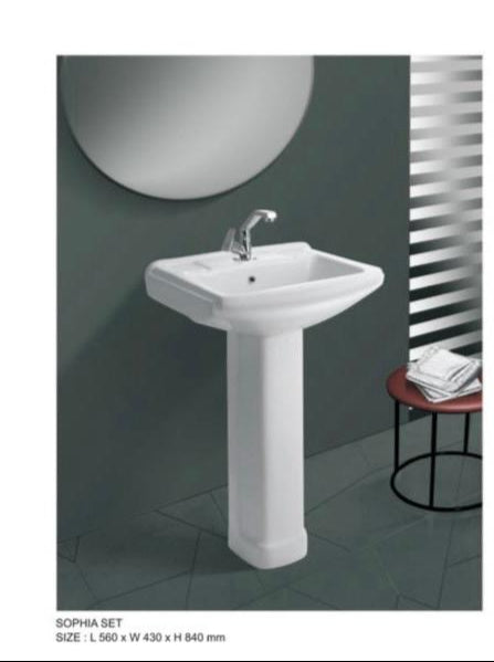 This is a pedestal wash basin, also known as a full pedestal basin or wash hand basin. This type of plumbing fixture is commonly found in bathrooms and powder rooms and is primarily used for personal hygiene activities such as washing hands, face, and teeth. It consists of a basin supported by a full pedestal that extends from the floor, concealing the plumbing connections. Pedestal basins are typically made from ceramic or porcelain, offering durability and a clean aesthetic. They offer a classic and traditional look, adding a of elegance to the bathroom space compared to integrated or wall-hung basin. It designed with a faucet  for water  supply and a drainage system to remove wastewater.