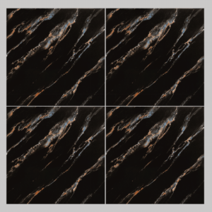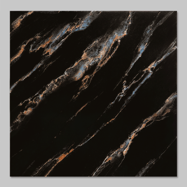 This tile is a black marble- effect porcelain tile, featuring prominent light blue and coppery- gold veining that is designed to replicate the look of natural marble. It has predominantly black with striking, irregular veins in white and shades of gold, creating a luxurious and sophisticated decorative. It appears to have a polished, high-gloss finish, which enhances the reflective qualities and depth of the marble effect. It's known for their durability, low water absorption (less than 0.5%) , and resistance to impact, humidity, and temperature changes, making them suitable for various applications.